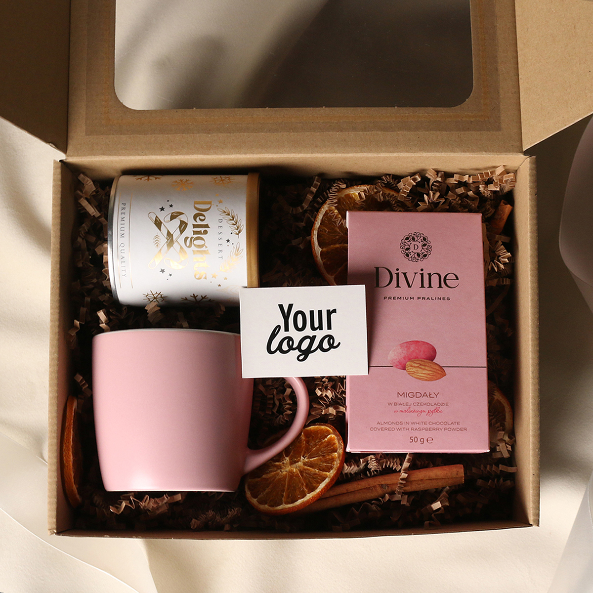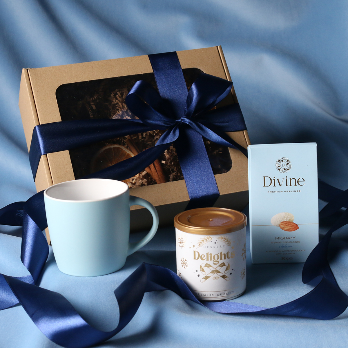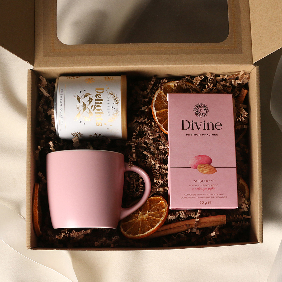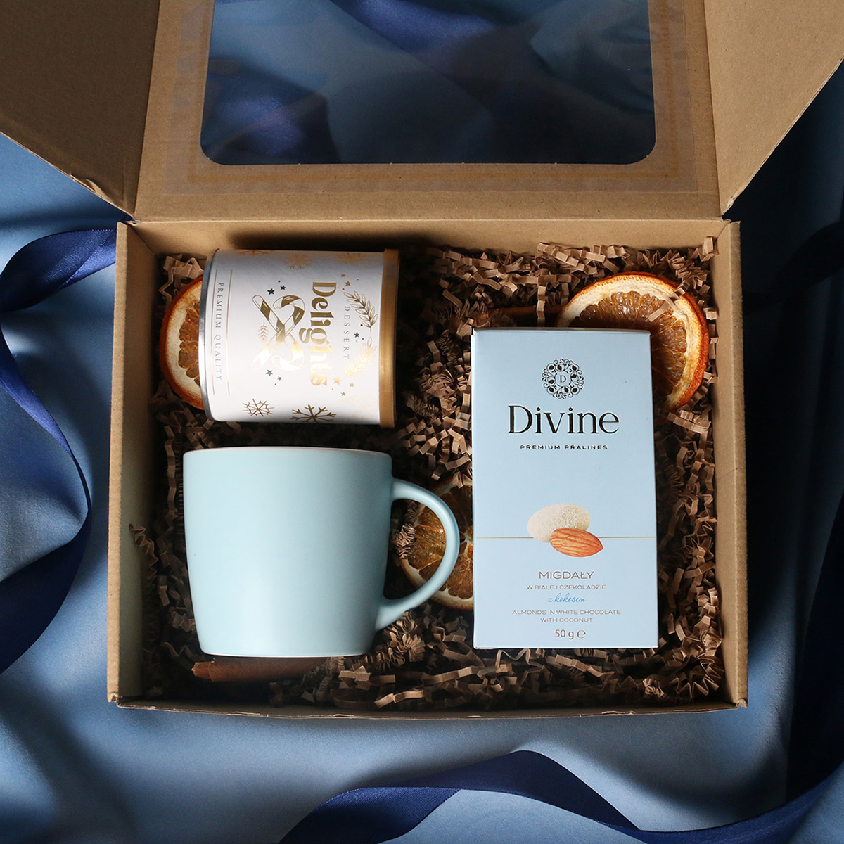 W skład zestawu wchodzą: kubek Handy Velvet rose pink-biały / baby blue-biały / Handy Cool szary-biały z możliwością zdobienia, Divine Pralines - migdały w czekoladzie z malinowym pudrem (różowy) / migdały w czekoladzie z kokosem (niebieski), skórka pomarańczy w czekoladzie deserowej (szary) Dessert Delights - Czarna porzeczka w białej czekoladzie z pudrem malinowym zapakowana w tubę z motywem zimowym. Całość w stylowym opakowaniu z tektury eco z okienkiem. Opcje dodatkowej customizacji: nadruk na kubku, bilecik z logo firmy, wstążka lub obwoluta z motywem zimowym wzbogacona złoceniem.
