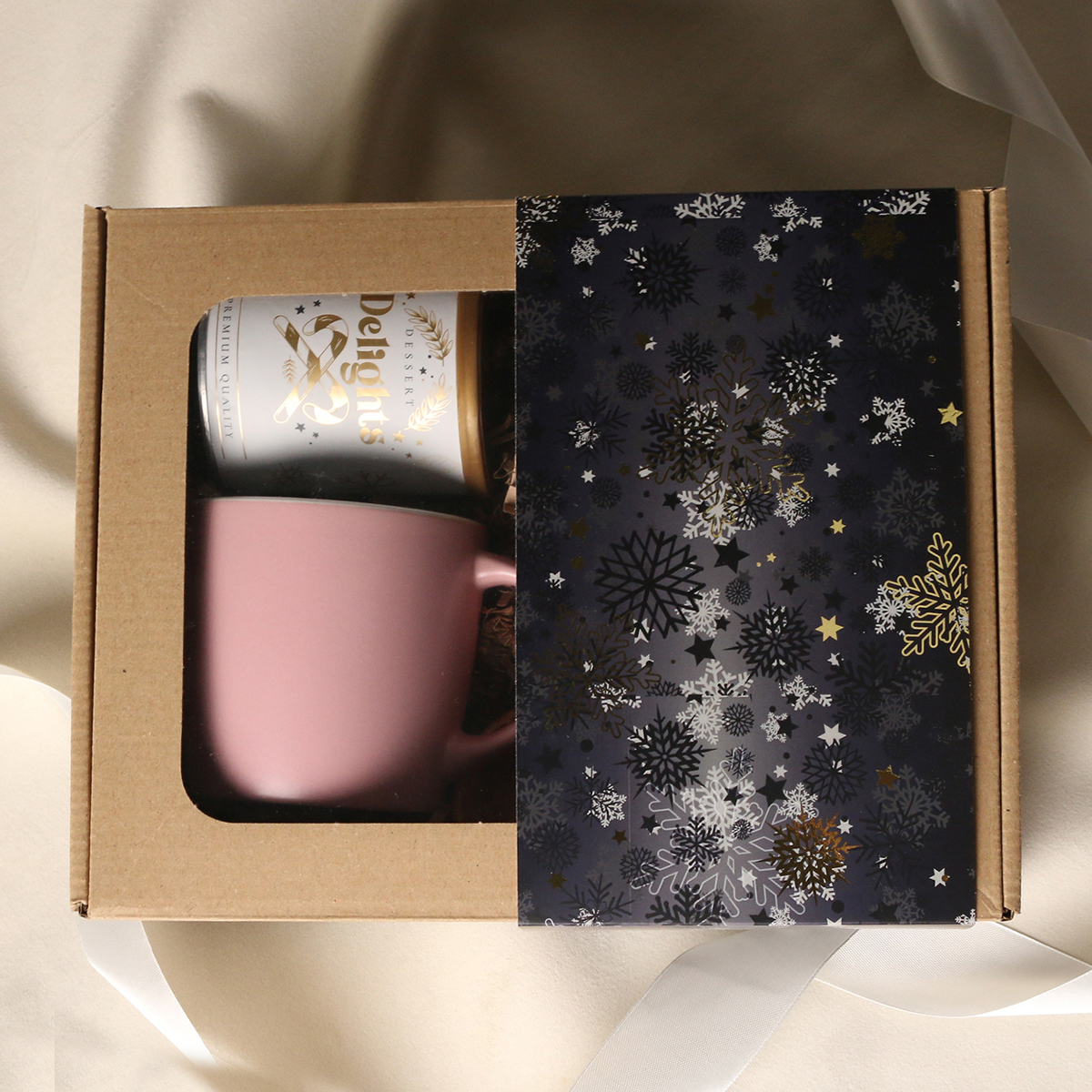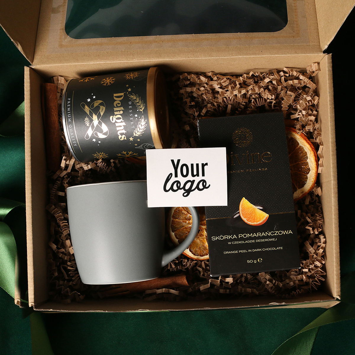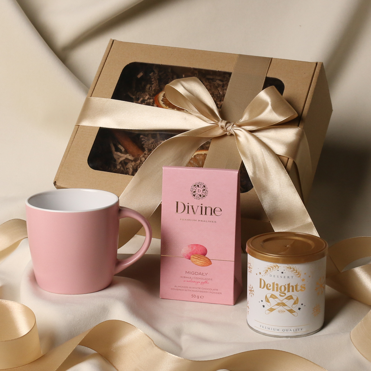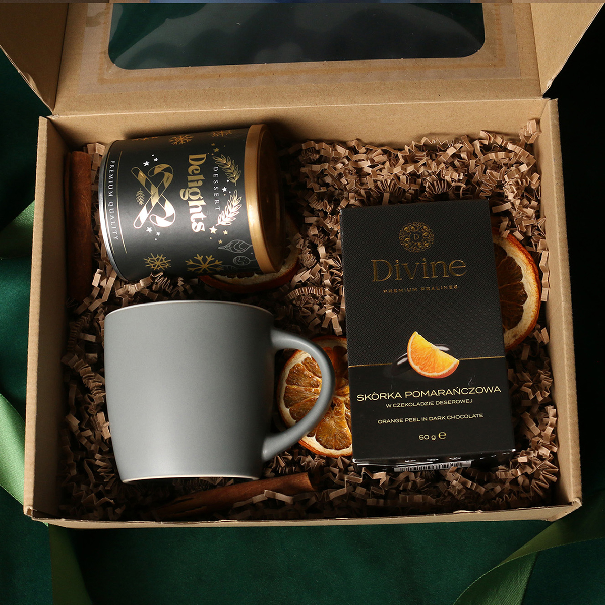 W skład zestawu wchodzą: kubek Handy Velvet rose pink-biały / baby blue-biały / Handy Cool szary-biały z możliwością zdobienia, Divine Pralines - migdały w czekoladzie z malinowym pudrem (różowy) / migdały w czekoladzie z kokosem (niebieski), skórka pomarańczy w czekoladzie deserowej (szary) Dessert Delights - Czarna porzeczka w białej czekoladzie z pudrem malinowym zapakowana w tubę z motywem zimowym. Całość w stylowym opakowaniu z tektury eco z okienkiem. Opcje dodatkowej customizacji: nadruk na kubku, bilecik z logo firmy, wstążka lub obwoluta z motywem zimowym wzbogacona złoceniem.