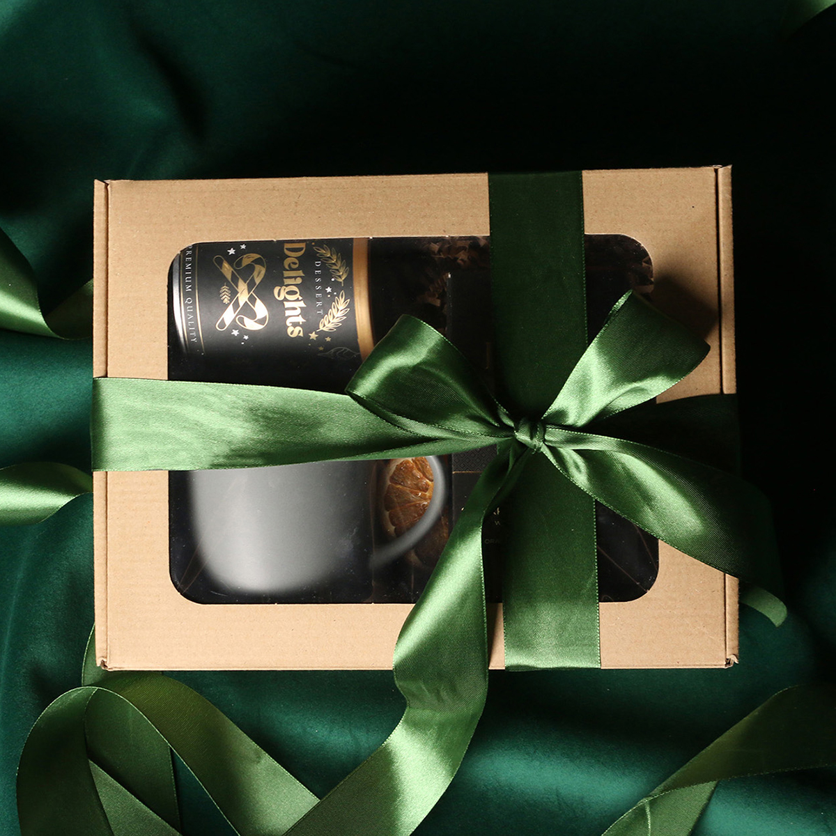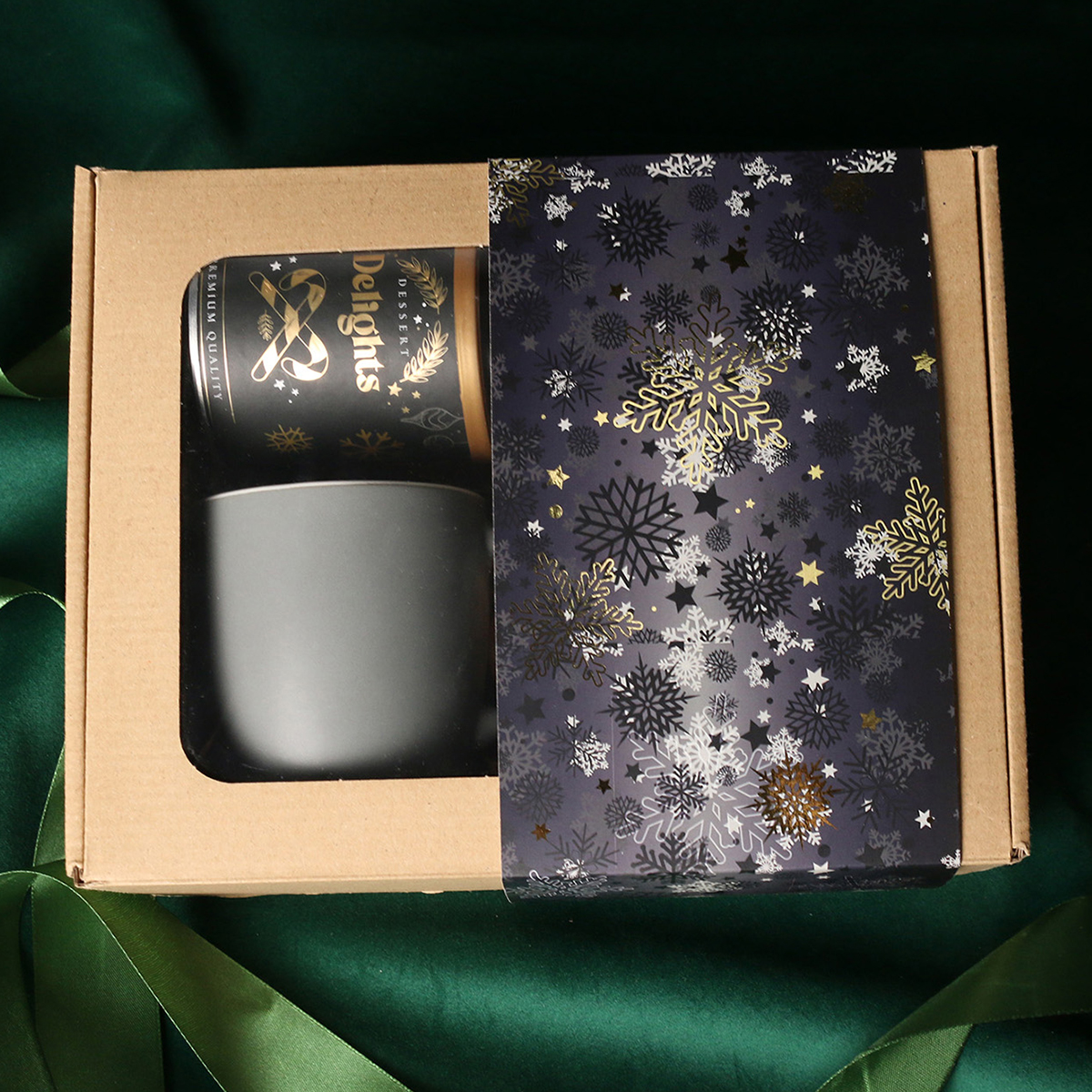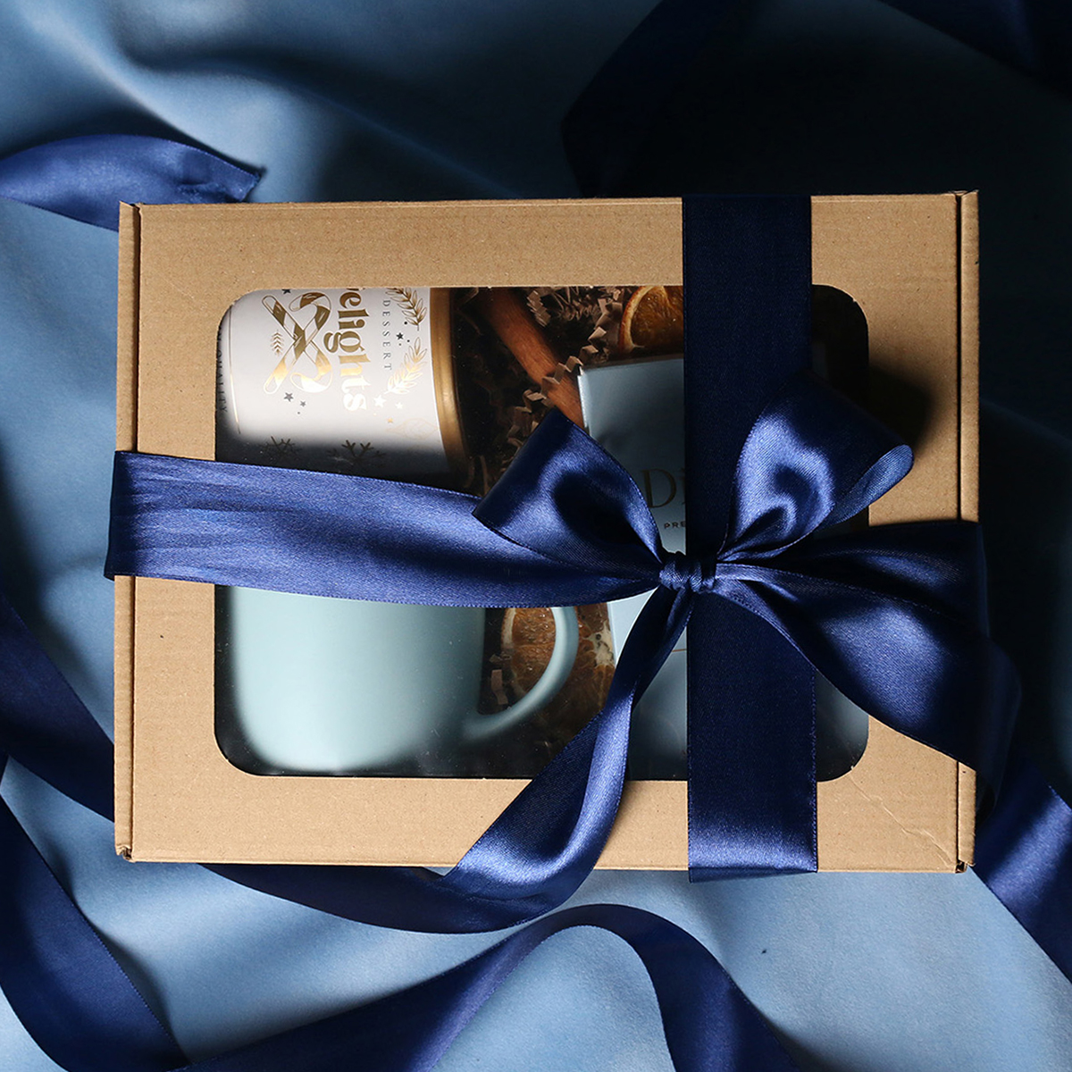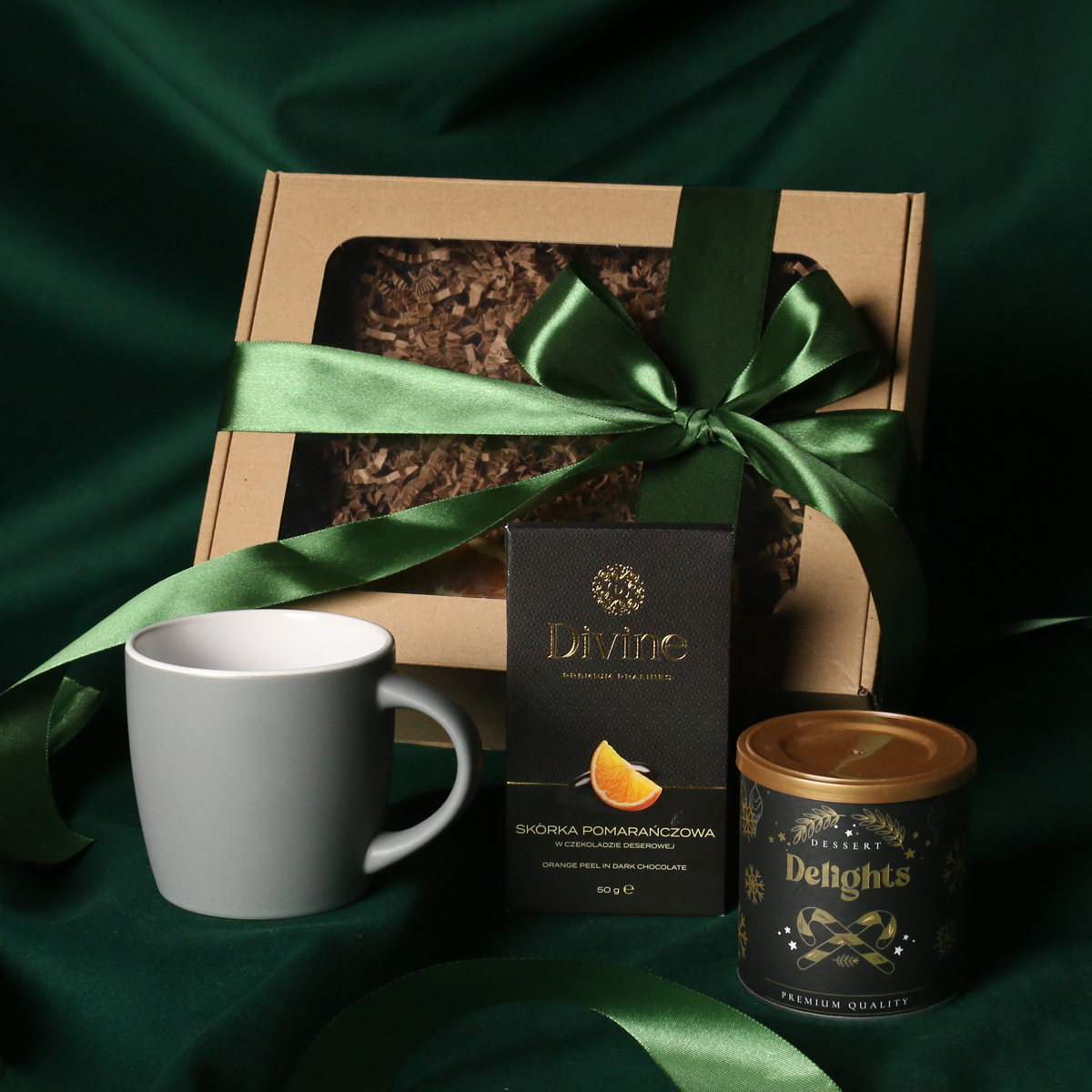 W skład zestawu wchodzą: kubek Handy Velvet rose pink-biały / baby blue-biały / Handy Cool szary-biały z możliwością zdobienia, Divine Pralines - migdały w czekoladzie z malinowym pudrem (różowy) / migdały w czekoladzie z kokosem (niebieski), skórka pomarańczy w czekoladzie deserowej (szary) Dessert Delights - Czarna porzeczka w białej czekoladzie z pudrem malinowym zapakowana w tubę z motywem zimowym. Całość w stylowym opakowaniu z tektury eco z okienkiem. Opcje dodatkowej customizacji: nadruk na kubku, bilecik z logo firmy, wstążka lub obwoluta z motywem zimowym wzbogacona złoceniem.